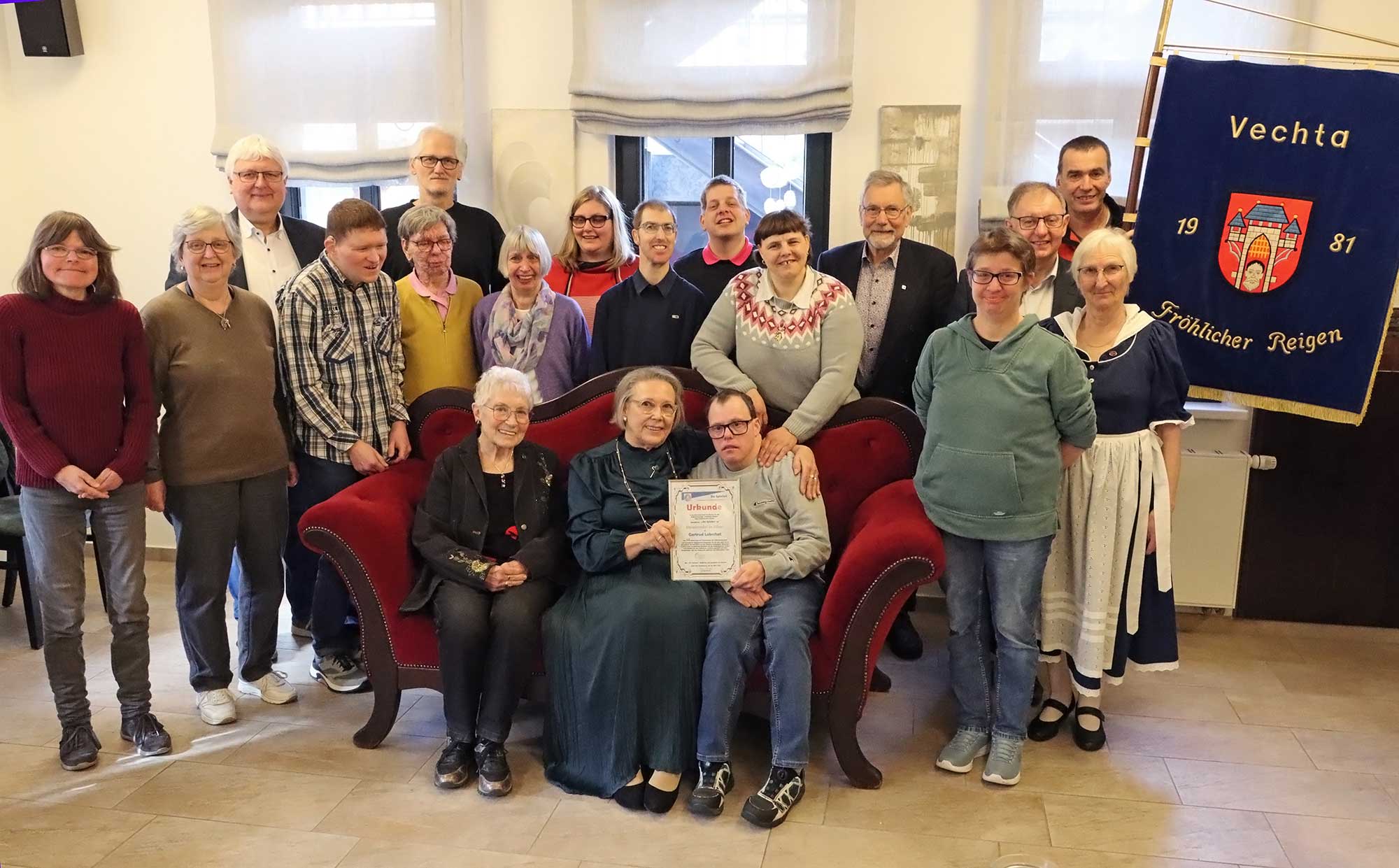 Im März 2001 hatte Gertrud Lobschat die Leitung der Tanzgruppe des Andreaswerkes übernommen. Fast genau 25 Jahre später verabschiedete sie sich bei einem Frühstück in der Manufaktur Vechta aus dieser Aufgabe. Ebenfalls unter den Gästen: Karin Linden und Ingrid Schnittger von „De Spieker – Heimatbund für niederdeutsche Kultur”. Im Namen des Vereins aus Oldenburg zeichneten sie Gertrud Lobschat mit der Ehrennadel in Silber aus und würdigten damit ihre Verdienste um die niederdeutsche Kultur, insbesondere den Volkstanz.